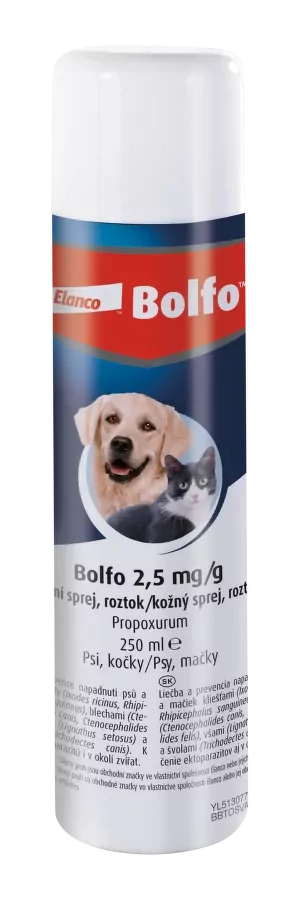 Bolfo sprej vhodný pro psy i kočky určený k hubení parazitů.