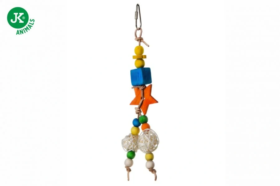 Dřevěná hračka se dvěma ratanovými koulemi určená k zavěšení do klece pomocí kovové karabiny.