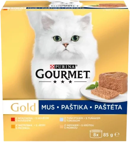 Gourmet Gold Multipack paštiky tuňák/játra/krůta/hovězí 8x85gskladem 9 ks139 Kč/ ks