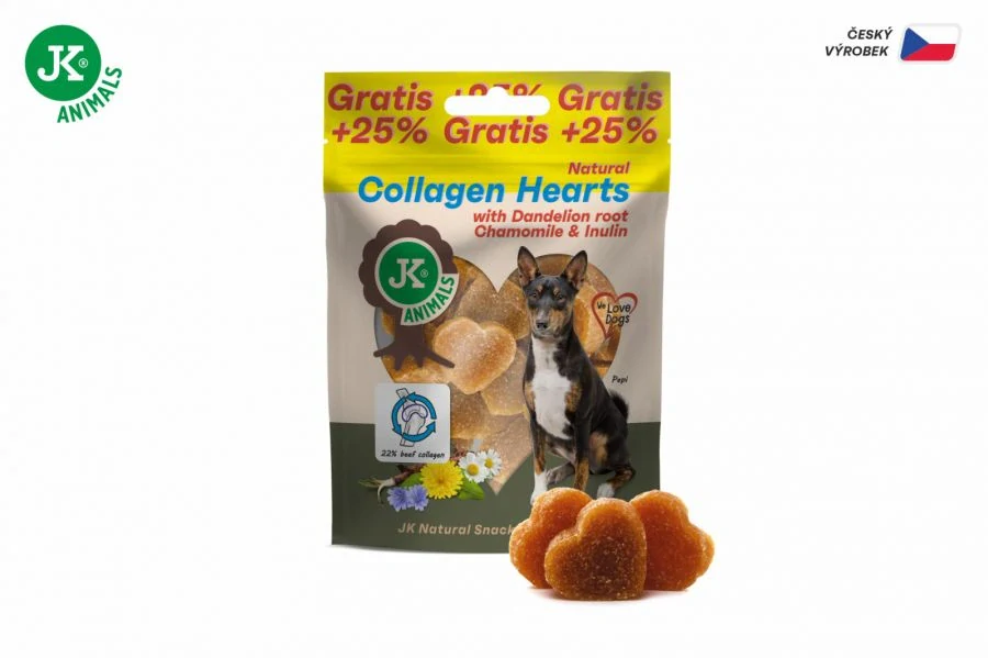 Kolagenová srdíčka s kořenem pampelišky, heřmánkem a inulinem. Doplňkové krmivo pro psy. Naturální pamlsek pro psy. Bez lepku, bez obilovin, bez sóji a bez GMO.