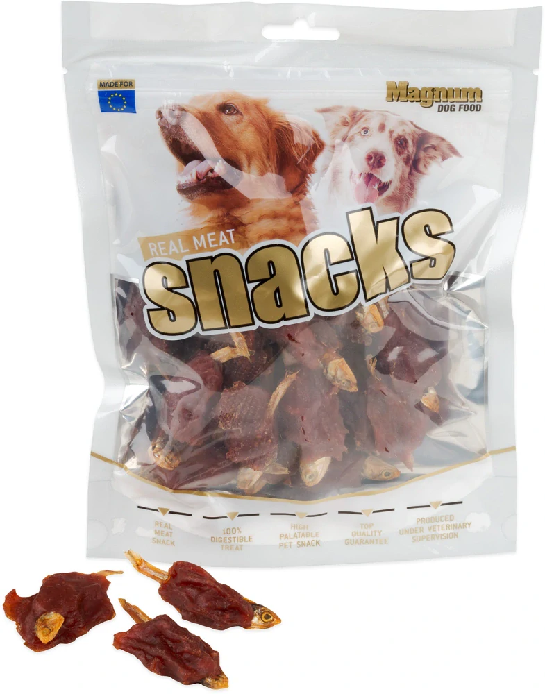 Měkká, přírodní masová pochoutka pro psy. Sušená rybka omotaná proužkem kachní svaloviny. Slouží jako odměna při hře, výcviku nebo jako doplněk stravy při cestách.